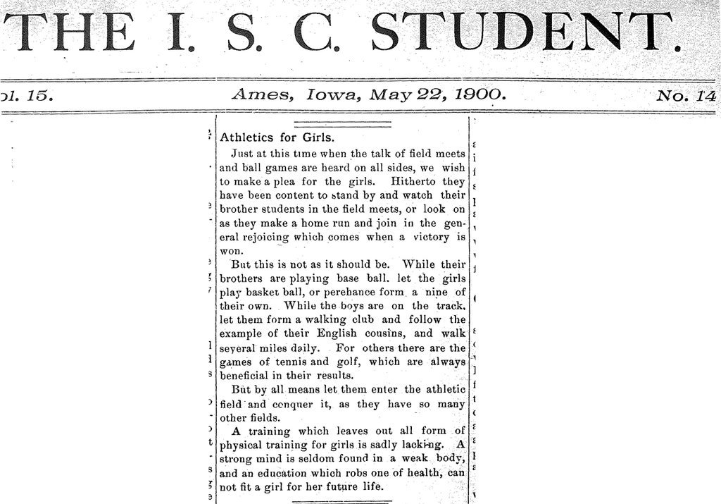 This is the first published piece calling for women’s athletics to be organized at Iowa State College. Prior to this, there were editorials promoting women’s involvement in sports and for their school spirit shown at men’s athletic events, but never for anything formal for their own.