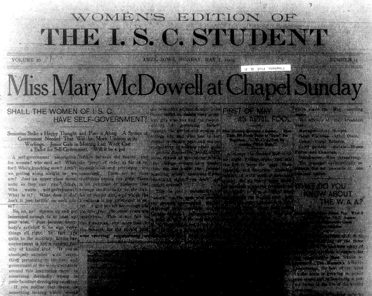This is the first women’s edition of The I.S.C. Student, which had the women write and edit everything in the paper. The men took the week off — the paper was weekly at this time. The front page had one story advocating for expanding women’s rights (“Shall the Women of I.S.C. Have Self-Government”) while the rest of page one was mostly business as usual. However, inside are stories about suffrage, temperance, fashion, beauty, and more. A women’s edition would be produced almost annually for the next several years.