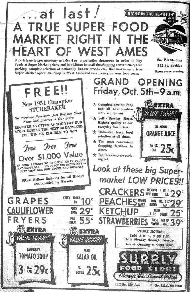 Ames’ newest modern supermarket, the Supply Food Store, 112 South Sheldon, will have its grand opening tomorrow and Saturday with a Studebaker Champion and more than $1,000 in groceries to be given away free. There will also be free helium-filled balloons for the children.